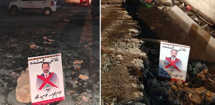 پمفلٹس میں چیئرمین کی تصاویر کے ساتھ نعرے درج ہیں جن میں “تلاش گمشدہ” اور “عوام کا پیسہ عوام پر خرچ کرو” شامل ہیں۔
