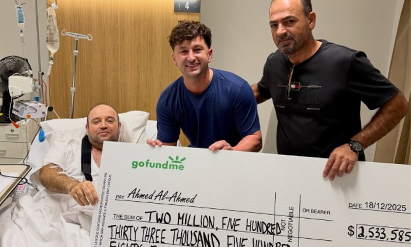 سڈنی کے بونڈی بیچ حملے کے ہیرو احمد الاحمد کو 25 لاکھ ڈالر سے زائد کی رقم کا چیک دے دیا گیا۔ یہ رقم 43 ہزار سے زائد عطیہ دہندگان کی جانب سے جمع کی گئی۔